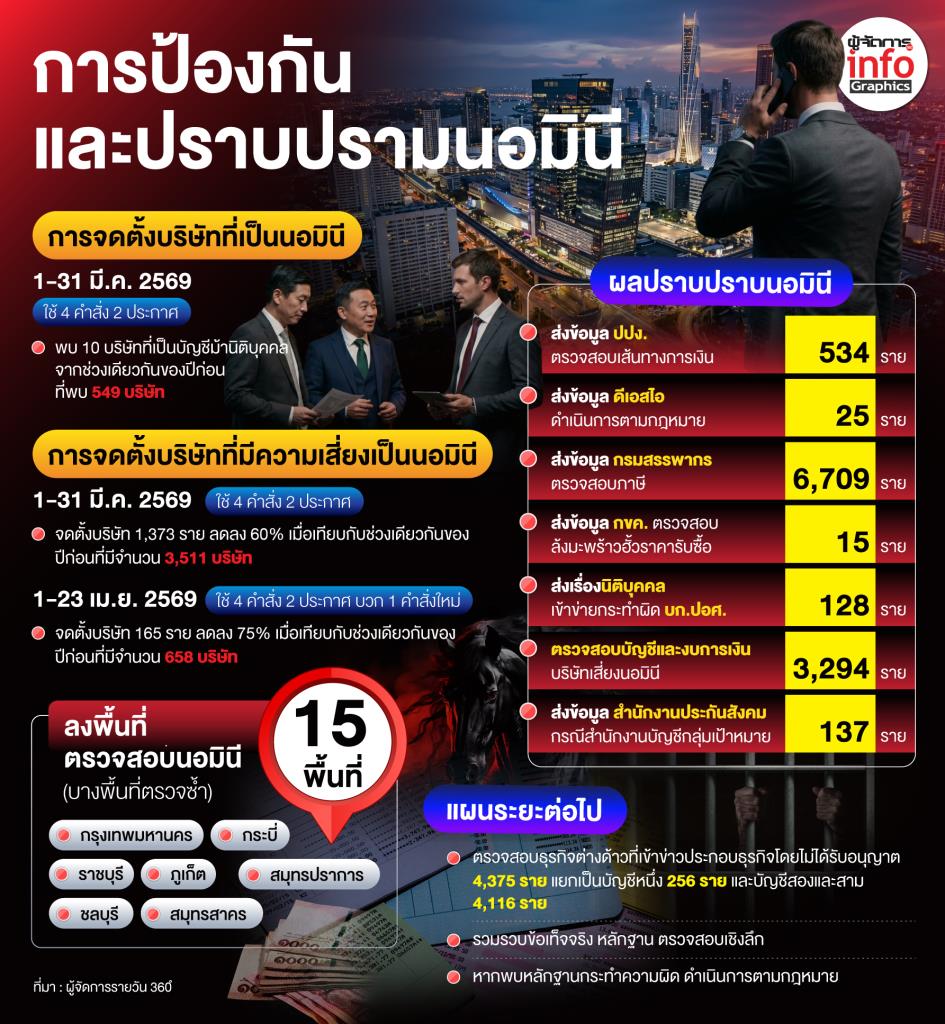 สำหรับการดำเนินมาตรการเข้มข้น มีความคืบหน้าต่อเนื่อง ทั้งการสกัดบัญชีม้านิติบุคคล ที่จะถูกนำไปใช้หลอกลวงคนไทย หรือนำไปใช้ทำธุรกิจที่สงวนไว้ให้กับคนไทย โดยได้เริ่มดำเนินการมาตั้งแต่วันที่ 1 ม.ค. 2569 ด้วยการออก 4 คำสั่ง 2 ประเทศ ซึ่งตอนนั้นได้มอบเป็นของขวัญปีใหม่ให้กับมิจฉาชีพ ทุนเทา ปรากฏผลการดำเนินการ ในช่วงไตรมาสแรก (1 ม.ค.-31 มี.ค.) พบการจัดตั้งบริษัทกลุ่มเสี่ยงนอมินีลดลงอย่างก้าวกระโดดถึง 60% โดยพบบริษัทกลุ่มเสี่ยง 1,373 บริษัท เมื่อเทียบกับสถิติช่วงเดียวกันของปี 2568 ที่มีจำนวน 3,511 บริษัท