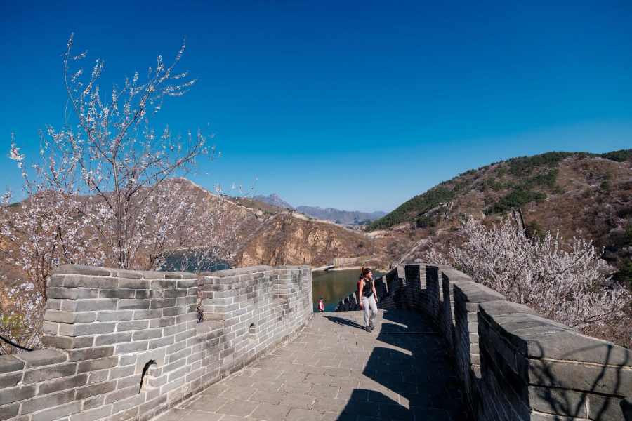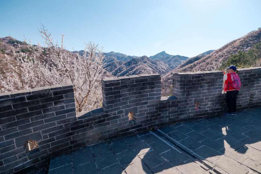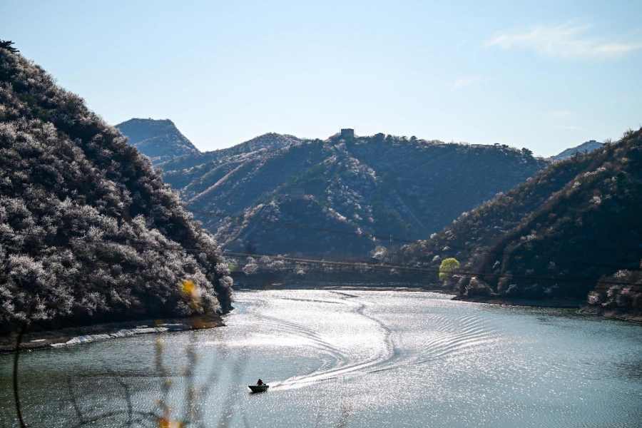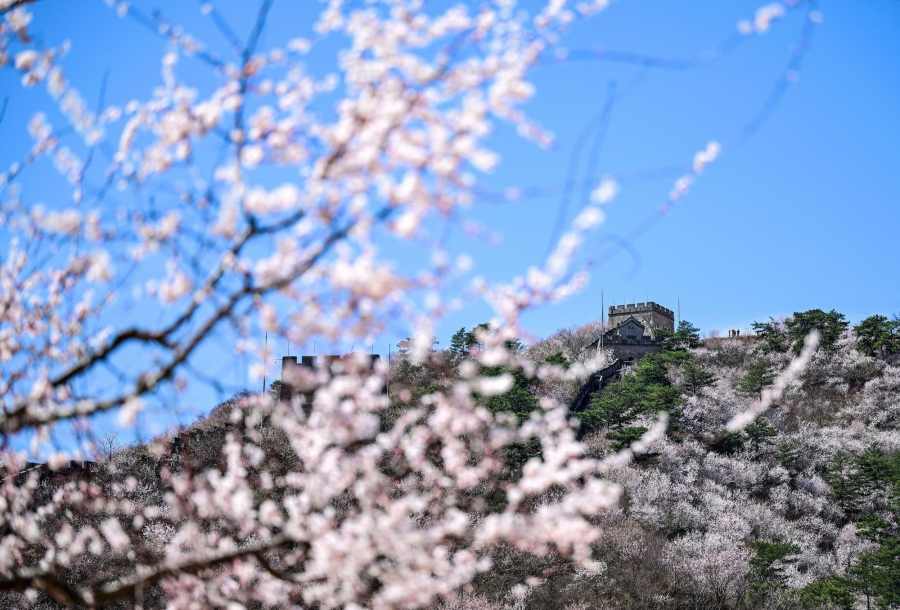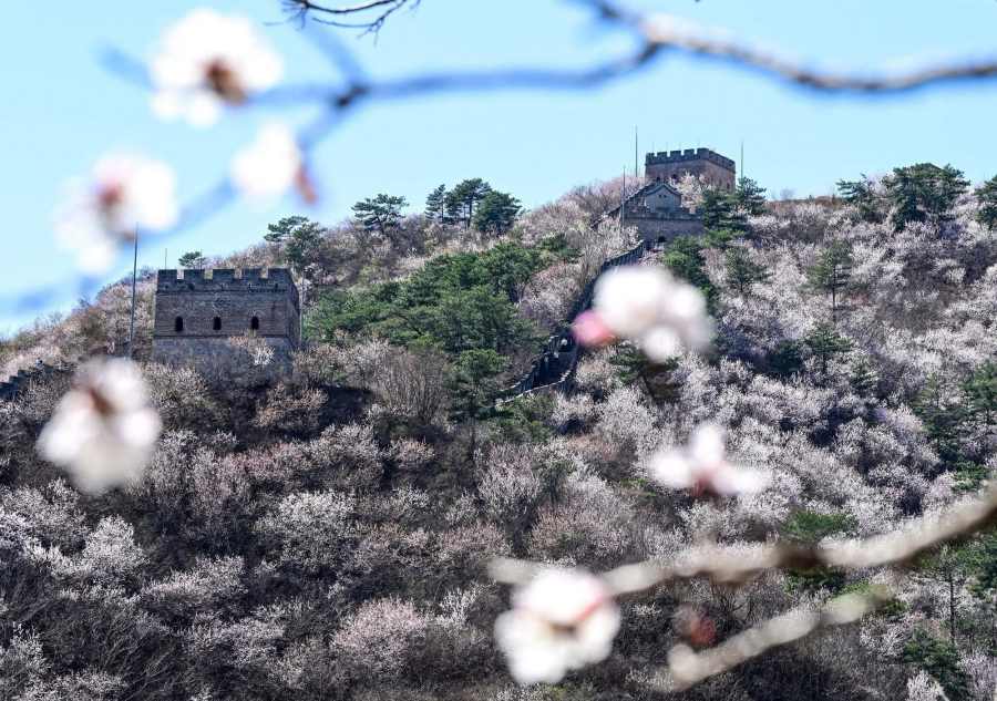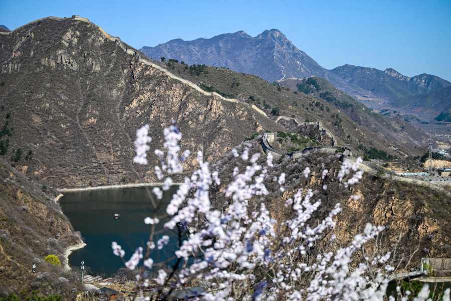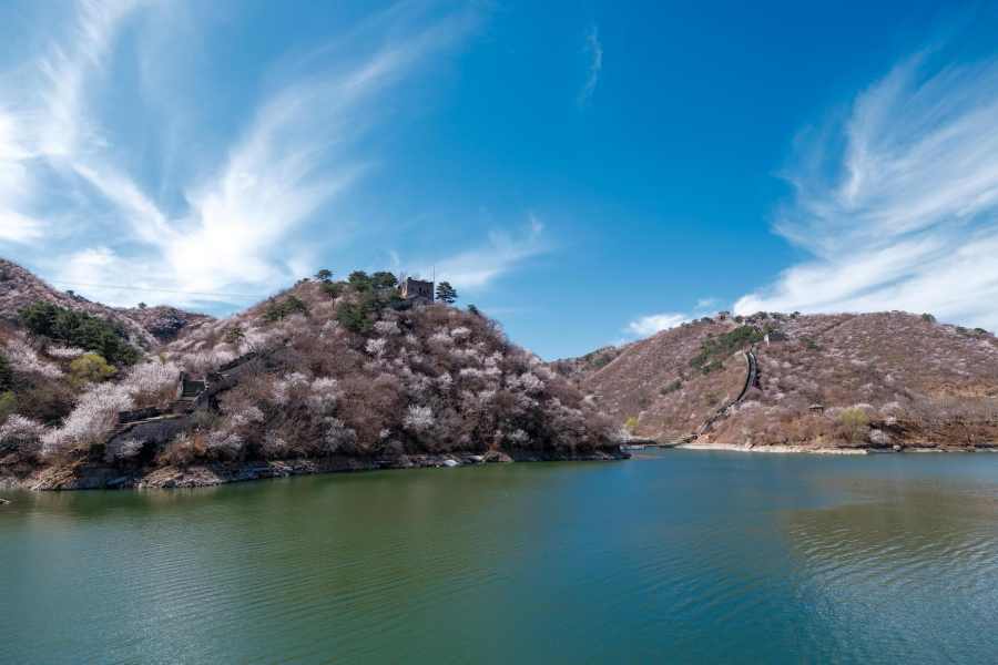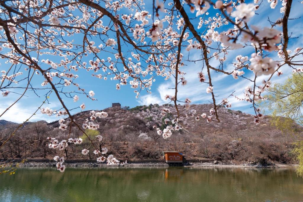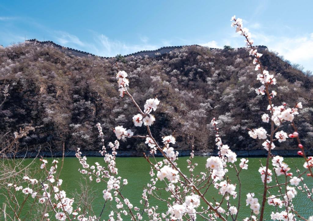ชมทิวทัศน์ดอกไม้สีหวานบานสะพรั่งแต้มสีสันกำแพงเมืองจีน ด่านหวงฮวาเฉิง ในเขตหวยโหรว กรุงปักกิ่งของจีน ซึ่งทอดตัวคดเคี้ยวไปตามสันเขาน้อยใหญ่ที่ตั้งตระหง่านเด่นอยู่ริมทะเลสาบ ท่ามกลางบรรยากาศฤดูใบไม้ผลิ