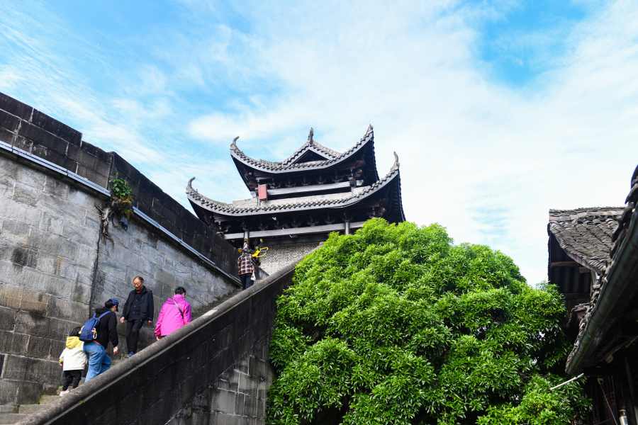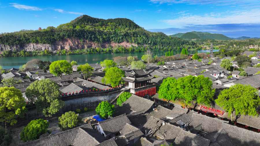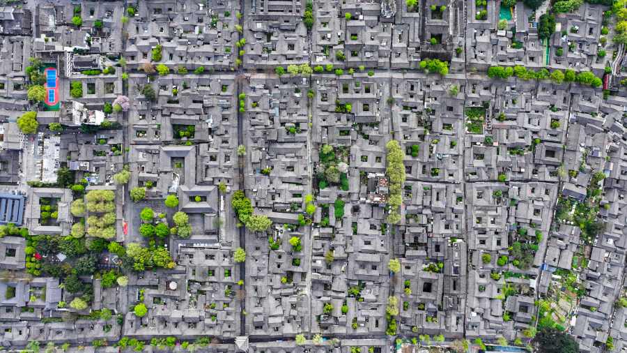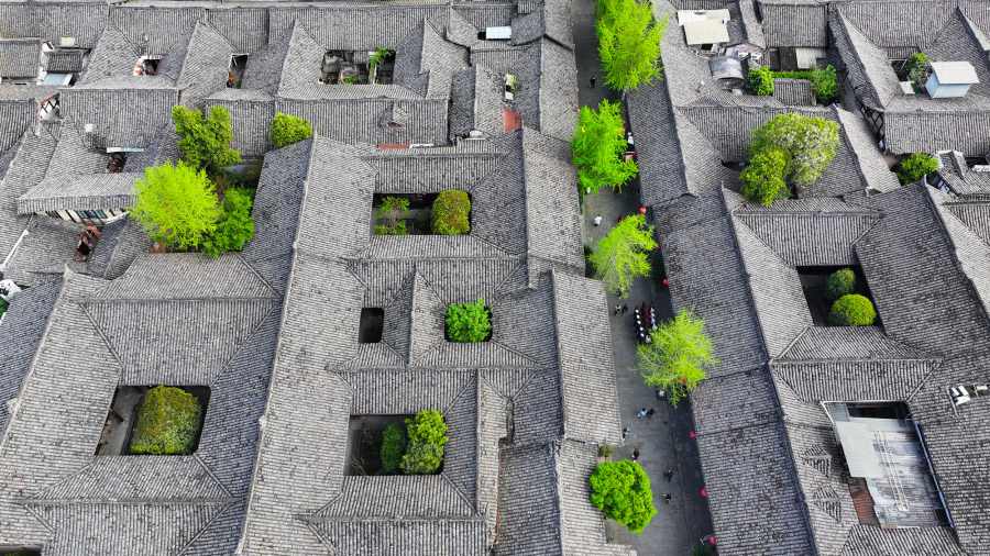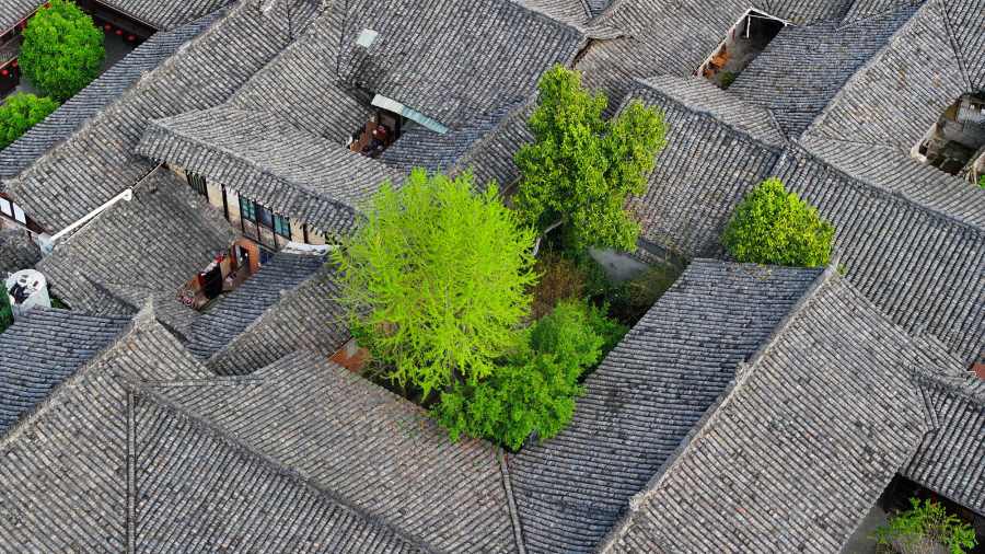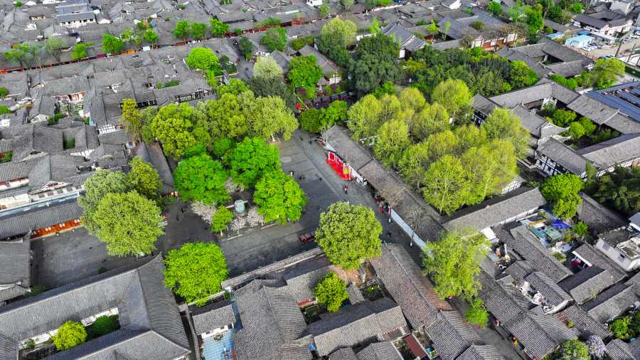 ชวนชมทิวทัศน์ต้นไม้ใหญ่ตามถนนและตรอกซอยของ “เมืองโบราณล่างจง” ในมณฑลซื่อชวน (เสฉวน) ทางตะวันตกเฉียงใต้ของจีน พากันเติบใหญ่ผลิใบเขียวขจีโผล่พ้นหลังคากระเบื้องดินเผาสีขุ่น ก่อเกิดเป็นฉากฤดูใบไม้ผลิที่สวยงามแต่งแต้มสีสันให้เมืองโบราณอายุเก่าแก่นับพันปีแห่งนี้