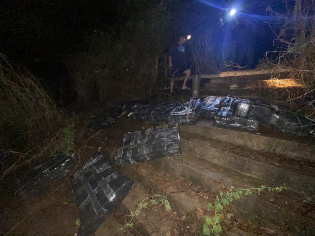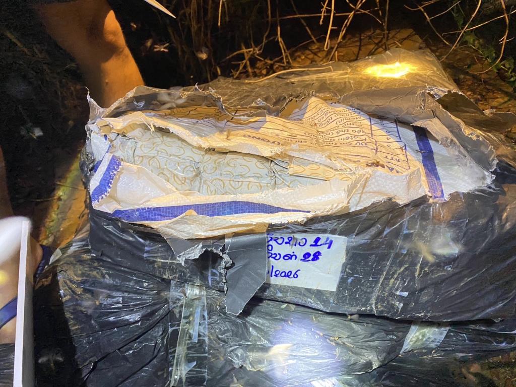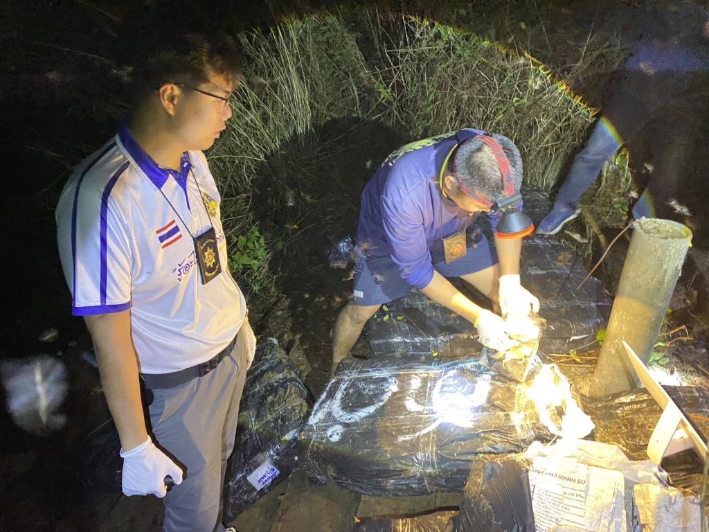 เจ้าหน้าที่จึงจัดกำลังลาดตระเวนเฝ้าตรวจ กระทั่งพบเรือต้องสงสัยลำหนึ่งแล่นมาจากฝั่งประเทศเพื่อนบ้าน พร้อมบุคคล 2 ราย ก่อนนำกระสอบต้องสงสัยขึ้นมาวางไว้บริเวณบันไดริมตลิ่ง เมื่อเจ้าหน้าที่แสดงตัวเข้าตรวจสอบ กลุ่มบุคคลดังกล่าวได้รีบหลบหนีลงเรือแล่นกลับไปยังฝั่ง สปป.ลาว ทันที