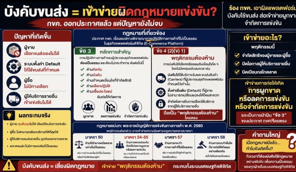 ทั้งที่ สำนักงาน กขค. ได้ออกประกาศควบคุมไว้อย่างชัดเจน โดย ข้อ 3 ห้ามการกระทำที่มีลักษณะกีดกัน บังคับ หรือจำกัดสิทธิ ซึ่งนำไปสู่การผูกขาด หรือลดการแข่งขัน หรือจำกัดการแข่งขันในตลาด และที่ชัดเจนที่สุดคือ ข้อ 4 (2)(ข) 1) ที่ระบุว่า การบังคับใช้บริการขนส่ง หรือการตั้งค่า Default ที่ผู้ขายไม่สามารถเปลี่ยนแปลงได้โดยสะดวก เป็น “พฤติกรรมต้องห้าม” โดยตรง แต่สิ่งที่เกิดขึ้นจริงกลับสวนทางและแพลตฟอร์มยังคงใช้รูปแบบเดิมอย่างไม่สะทกสะท้านต่อกฎหมาย