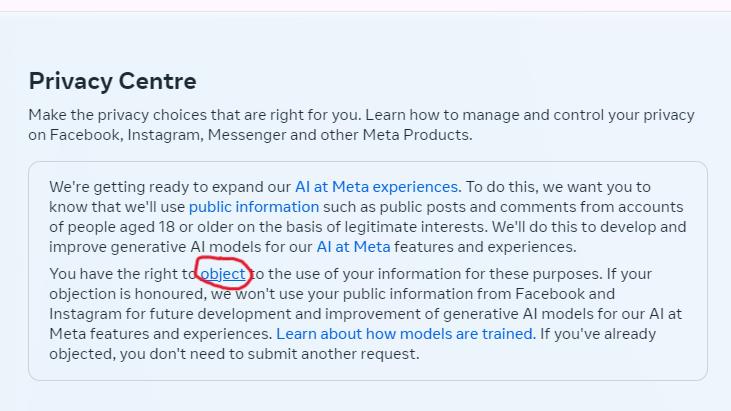 ตั้งแต่ปี 2026 เป็นต้นมา Meta ใช้โพสต์สาธารณะ ภาพถ่าย ความคิดเห็น และแคปชันในการฝึกโมเดล AI สำหรับผู้ใช้ในภูมิภาคที่มีกฎหมายคุ้มครองข้อมูล เช่น สหภาพยุโรปหรือสหราชอาณาจักร สามารถใช้สิทธิ Object ได้ใน Privacy Center ภายใต้ส่วน AI at Meta