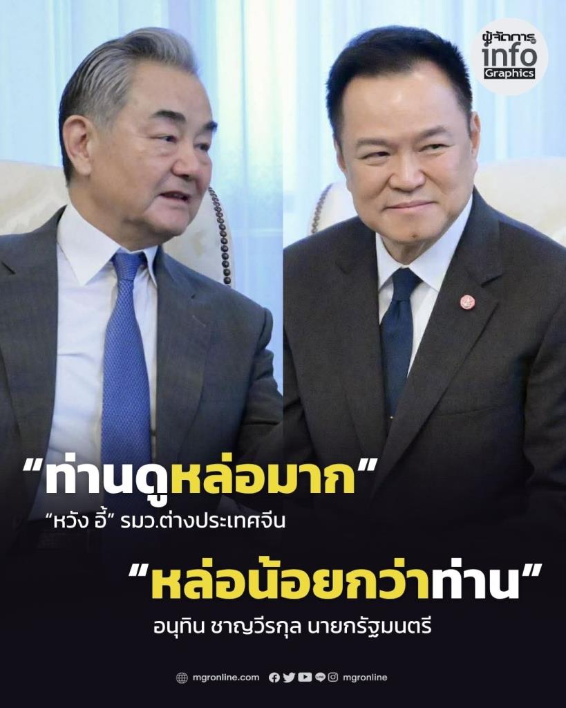 ทันทีที่คณะผู้แทนเดินทางถึง ผู้นำทั้งสองฝ่ายได้จับมือทักทายกันอย่างเป็นมิตร ก่อนที่นายหวัง อี้ จะกล่าวทักทายเป็นภาษาจีนพร้อมเอ่ยคำชมเชิงหยอกล้อว่า “ท่านดูหล่อมากๆ” ส่งผลให้นายกรัฐมนตรีไทยยิ้มรับและตอบกลับด้วยท่าทีถ่อมตนว่า “หล่อน้อยกว่าท่าน” สร้างบรรยากาศผ่อนคลายและเสียงหัวเราะในวงสนทนา ก่อนที่ทั้งสองฝ่ายจะเชิญกันถ่ายภาพร่วมกันเป็นที่ระลึก