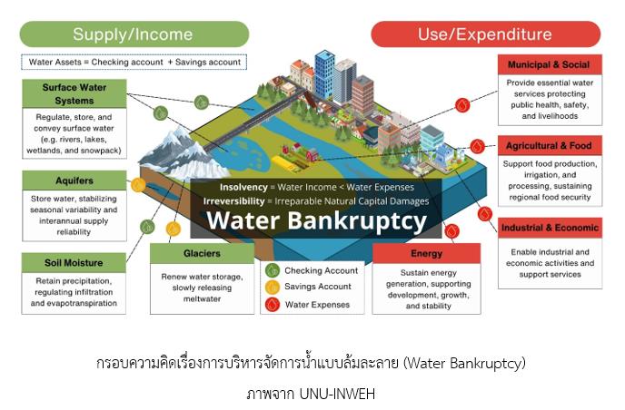 เมื่อวิกฤตการณ์น้ำกำลังทวีความรุนแรงขึ้นทุกปี โลกปัจจุบันจึงกำลังมีสถานภาพล้มละลายทางน้ำ ทำให้ประชากรโลก 8,290 ล้านคนที่โลกมี กำลังต่อสู้กับวิกฤตการณ์น้ำ ข้อมูลการสำรวจขององค์การสหประชาชาติระบุว่า พลโลก 2,300 ล้านคนกำลังขาดแคลนน้ำ ผู้คน 3,500 ล้านคนขาดสุขอนามัยทางน้ำ 6,000 ล้านคน กำลังอาศัยอยู่ในบริเวณที่น้ำจืดพร่องปริมาณไปทุกปี และความต้องการน้ำจืดที่จะมาถึงระดับวิกฤตในปี 2035 โดยมีสาเหตุหลัก ๆ จาก