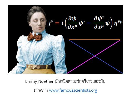 บุคคลแรกที่สามารถพิสูจน์ให้เห็นได้ว่า กฎอนุรักษ์เหล่านี้เป็นผลลัพธ์ที่เกิดจากการมีสมมาตรเชิงคณิตศาสตร์ คือ นักคณิตศาสตร์สตรีชาวเยอรมันชื่อ Emmy Noether (1882-1935) ซึ่ง A. Einstein ได้เคยกล่าวยกย่องเธอว่าเป็นนักคณิตศาสตร์สตรีผู้ยิ่งใหญ่ที่สุด เมื่อเธอเสียชีวิตลงในปี 1935