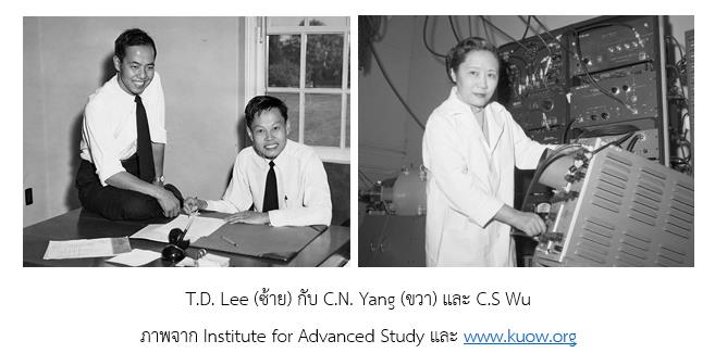 ในปี 1956 C.N. Yang (1922-2025) กับ T.D. Lee (1926-2024) ได้คำนวณพบว่า ในการสลายตัวของนิวเคลียสกัมมันตรังสีโคบอลต์ (Co-60) ที่มีการปล่อยรังสีบีตา กฎอนุรักษ์ parity จะไม่เป็นจริง นั่นคือ ในระบบที่มีอันตรกิริยานิวเคลียร์อย่างอ่อน (weak interaction) P symmetry จะไม่เป็นจริง และการคาดการณ์นี้ก็ได้รับการยืนยันว่า ถูกต้อง ในปี 1957 โดย C.S Wu และผลงานนี้ทำให้ C.N. Yang กับ T.D. Lee ได้รับรางวัลโนเบลฟิสิกส์ในปี 1957 และ Yang ก็ได้เสนอแนะว่า อันตรกิริยาควอนตัมชนิดใหม่ ก็สามารถหาได้จากการศึกษาสมบัติสมมาตรใหม่ของระบบควอนตัมนั้น