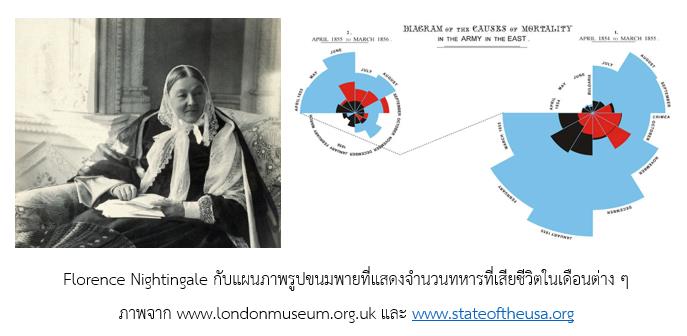 ด้าน Florence Nightingale (1820-1910) เป็นพยาบาลชาวอังกฤษ ผู้ได้นำวิชาสถิติมาใช้ในการวิเคราะห์การเสียชีวิตของทหารในสงคราม Crimea และได้พบว่าสาเหตุหลักที่ทำให้ทหารเสียชีวิต เกิดจากการได้รับการรักษาพยาบาลที่ไม่ถูกสุขลักษณะยิ่งกว่าการถูกยิงตายในสนามรบ โดยเธอได้นำตัวเลขนี้ไปเสนอเป็นแผนภาพขนมพาย (pie diagram) เป็นครั้งแรก นี่จึงเป็นการนำเสนอ Data Visualization (การเห็นข้อมูลเป็นแผนภาพ) ที่ทำให้เข้าใจความหมายของตัวเลขในเชิงปริมาณชัดขึ้น