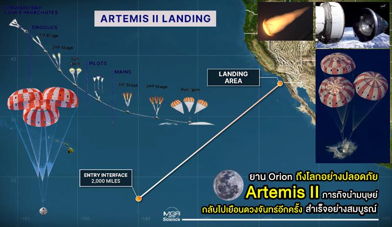 องค์การบริหารการบินและอวกาศแห่งชาติสหรัฐฯ หรือ องค์การนาซา (NASA) เผย ยาน Orion พร้อมนักบินอวกาศทั้ง 4 ในภารกิจ Artemis 2 ได้เดินทางกลับสู่โลกอย่างปลอดภัย เมื่อเวลาประมาณ 07.07 น. วันที่ 11 เมษายน 2026 (ตามเวลาประเทศไทย) โดยลงจอดบริเวณมหาสมุทรแปซิฟิก นอกชายฝั่งรัฐแคลิฟอร์เนีย สหรัฐอเมริกา นับเป็นการจบภารกิจการนำมนุษย์เดินทางกลับไปเยือนดวงจันทร์อีกครั้งในรอบกว่า 50 ปี สำเร็จอย่างสมบูรณ์