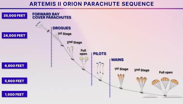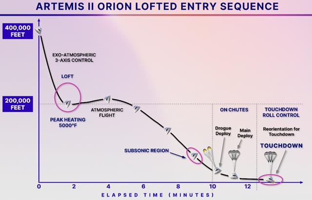 การเดินทางกลับสู่พื้นผิวโลกของภารกิจ Artemis 2 ยาน Orion ได้แยกส่วนก่อนเดินทางเข้าสู่ชั้นบรรยากาศโลก โดยยานแคปซูลได้แยกตัวออกจากยานบริการ (Service Module) ซึ่งทำหน้าที่ขับเคลื่อนเพื่อเดินทางไปและกลับจากดวงจันทร์ เหลือเพียงแคปซูลที่บรรทุกนักบินทั้ง 4 โคจรเข้าสู่ชั้นบรรยากาศโลกที่ความสูงประมาณ 120 กิโลเมตร และเคลื่อนที่ลงสู่พื้นผิวโลกด้วยความเร็วประมาณ 40,000 กิโลเมตรต่อชั่วโมง การเคลื่อนที่ผ่านชั้นบรรยากาศทำให้เกิดการเสียดสีทำให้เกิดความร้อนสูงที่มีอุณหภูมิสูงประมาณ 2,700 องศาเซลเซียสรอบยาน โดยจะเห็นยานถูกห่อหุ้มเปลวไฟลุกโชน เมื่อผ่านช่วงเสียดสีกับชั้นบรรยากาศยานได้กางร่มชูชีพออกเพื่อชะลอความเร็วตามลำดับความสูง และได้ลงจอดสู่มหาสมุทรแปซิฟิกบริเวณนอกชายฝั่งรัฐแคลิฟอร์เนีย สหรัฐอเมริกา โดยมีทีมกู้ภัยของสหรัฐฯ รอรับ นำตัวนักบินและยานแคปซูลกลับขึ้นฝั่งอย่างปลอดภัย