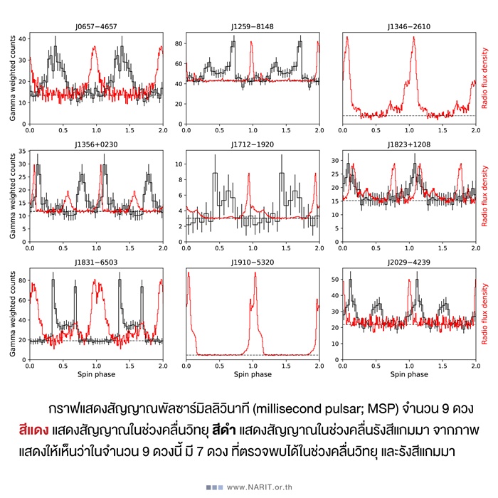 เมื่อค้นพบพัลซาร์ในช่วงคลื่นวิทยุแล้ว ได้จับเวลาพัลซาร์ (pulsar timing) เพื่อหาค่าต่างๆ และใช้ผลลัพธ์การจับเวลา (timing solution) ที่บ่งบอกถึงลักษณะของพัลซาร์และวงโคจร เป็นจุดตั้งต้นในการค้นหาพัลซาร์ในช่วงคลื่นรังสีแกมมา โดยใช้ข้อมูลเดิมจาก LAT ผลการวิเคราะห์พบว่า พัลซาร์มิลลิวินาที 9 ดวงนี้ มี 7 ดวง ที่ตรวจพบได้ในช่วงคลื่นวิทยุและรังสีแกมมา ยืนยันว่าพัลซาร์เหล่านี้ปล่อยสัญญาณทั้งสองช่วงคลื่น นอกจากนี้ ได้จับเวลาพัลซาร์ช่วงคลื่นวิทยุและรังสีแกมมาร่วมกัน (joint pulsar timing) เพื่อทำให้สามารถศึกษาวงโคจรได้ละเอียดยิ่งขึ้น และพบว่ามี 6 ดวงที่เป็นพัลซาร์ชนิดพิเศษที่เรียกว่า “พัลซาร์แมงมุม”