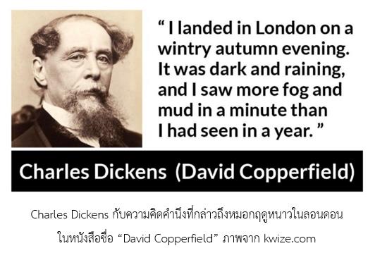 ด้านนักประพันธ์ชื่อ Charles Dickens (1812–1870) เจ้าของบทประพันธ์คลาสสิกเรื่อง “A Tale of Two Cities”, “David Copperfield” และ “Oliver Twist” ก็ได้เคยเอ่ยถึงฝุ่นในลอนดอนว่า มีขนาดใหญ่เท่าเกล็ดหิมะ ประกอบกับในช่วงเวลานั้นเป็นยุคปฏิรูปอุตสาหกรรม นครลอนดอนจึงคลาคล่ำด้วยฝุ่น แต่สภาพทางเศรษฐกิจก็ยังอยู่ดี จนกระทั่งมีคำกล่าวว่า “Where there's muck, there's brass” ซึ่งแปลว่า “ที่ใดมีความสกปรก ที่นั่นมีเงินทอง”
