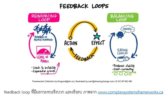 ระบบเชิงซ้อน เช่น เมือง จึงเป็นเสมือนสิ่งมีชีวิตชนิดหนึ่ง เพราะอะไรที่เกิดขึ้นกับเมืองจะมีผลกระทบในอีกหลายด้าน และผลกระทบเหล่านั้นอาจจะมาเสริมหรือต่อต้านอิทธิพลที่ทำให้เกิดการเปลี่ยนแปลงก็ได้ การทำงานของวงจรป้อนกลับ (feedback loop) จึงมีลักษณะเหมือนอุปกรณ์ควบคุมอุณหภูมิอัตโนมัติ (thermostat) ทำหน้าที่ควบคุมอุณหภูมิ โดยการสั่งเปิด-ปิดวงจรของระบบทำความร้อนและความเย็น เช่น การมีเทอร์โมสตัทในแอร์ ตู้เย็น เครื่องทำน้ำอุ่น เพื่อให้อุณหภูมิคงที่ตามค่าที่ได้ตั้งไว้
