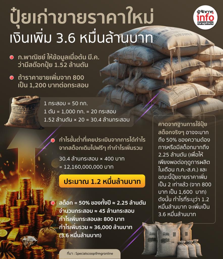 ทั้งนี้ตามที่รัฐบอกว่าสต๊อกปุ๋ยมี 1.52 ล้านตัน เมื่อราคาปรับขึ้นไปจากเดิมกระสอบละ 800ขึ้นเป็น 1,200 บาท แปลว่าเขามีส่วนได้เพิ่มกระสอบละ 400 บาท ส่วนมูลค่าเบ็ดเสร็จจะเป็นเท่าไหร่นั้นก็ต้องคิดจาก 1กระสอบ เท่ากับ 50 กิโลกรัม และ 1ตันเท่ากับ 1,000 กิโลกรัมและเท่ากับ 20 กระสอบ