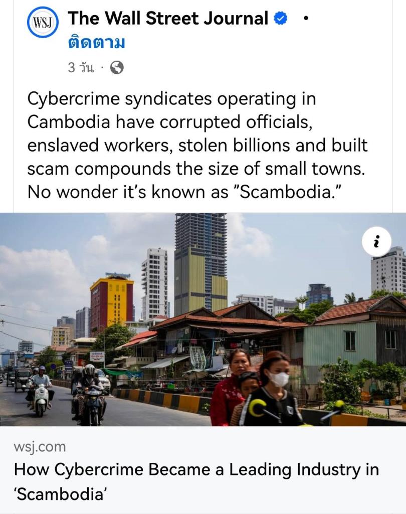 ตามมาด้วยสื่อดังระดับโลกอย่าง The Wall Street Journal (WSJ) ที่มีการนำเสนอรายงานเรื่อง Scambodia ที่กล่าวถึงกัมพูชา 19 เมษายน 2569 ว่า