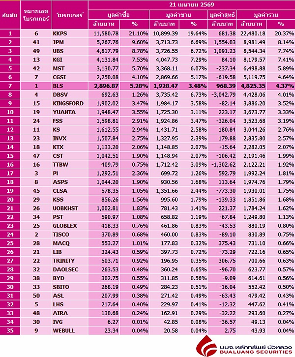 Broker ranking 21 Apr 2026 เผยแพร่: 21 เม.ย. 2569 23:20 ปรับปรุง: 21 เม.ย. 2569 23:20 โดย: ผู้จัดการออนไลน์ อันดับการซื้อขายหลักทรัพย์ของบริษัทหลักทรัพย์ประจำวันที่ 21 เมษายน 2569 บริษัทหลักทรัพย์ บล.บัวหลวง Broker ranking อันดับโบรกเกอร์